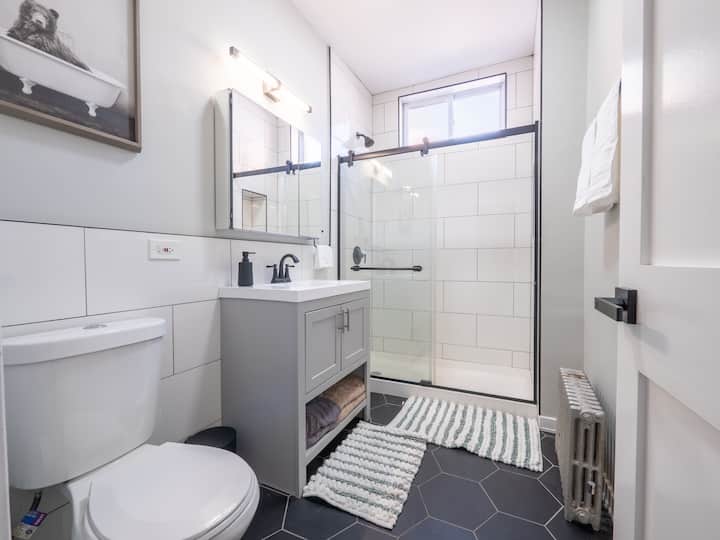 Después de las habitaciones se encuentra un baño renovado con acabados limpios y modernos y todo lo esencial que necesitas para prepararte para tu día.