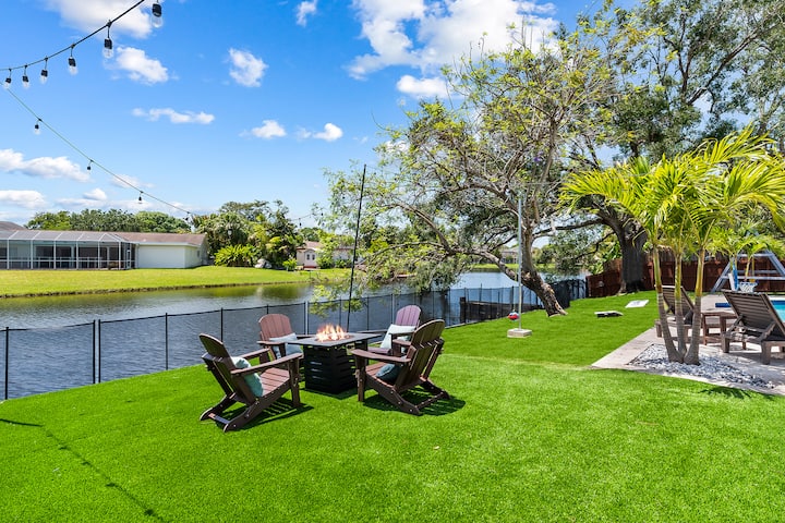 Disfrute de un oasis privado en el sur de Florida a minutos del centro comercial Sawgrass, perfecto para la familia y los amigos. Disfruta de las vistas al agua, el acceso al lago y un patio trasero construido para la diversión.