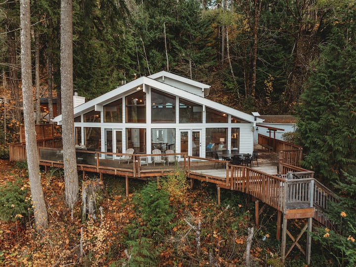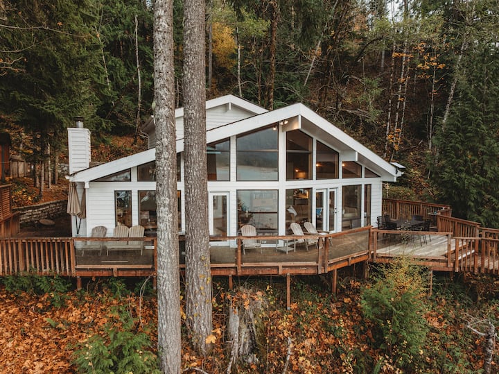 Cuando estés listo para salir, relájate en la espaciosa terraza con vistas al lago, completa con asientos al aire libre y una parrilla para que la uses. Desde allí, baja por la escalera bien cuidada hasta tu muelle privado, donde puedes nadar o sacar los kayaks que te proporcionamos. También ofrecemos un sendero alternativo para caminar cuesta abajo hasta el muelle si lo prefieres.