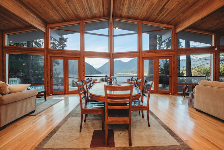 Mientras caminas por la puerta principal, entrarás en una gran habitación con techo alto y ventanas del piso al techo. Relájate en cualquiera de los dos sofás para ver una película en el televisor inteligente o simplemente siéntate y disfruta de las vistas a la montaña y al lago. Una vez que estés listo para cenar, siéntate en la gran mesa del comedor.