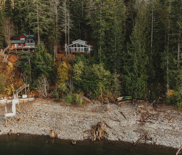 Baja por la escalera bien cuidada hasta tu propio muelle privado, donde te proporcionamos kayaks para que explores el lago. Nota: es un número decente de escaleras, pero vale la pena una vez que estés en el agua. Alternativamente, hay un sendero inclinado en zigzag que también conduce al lago si prefieres un paseo gradual.