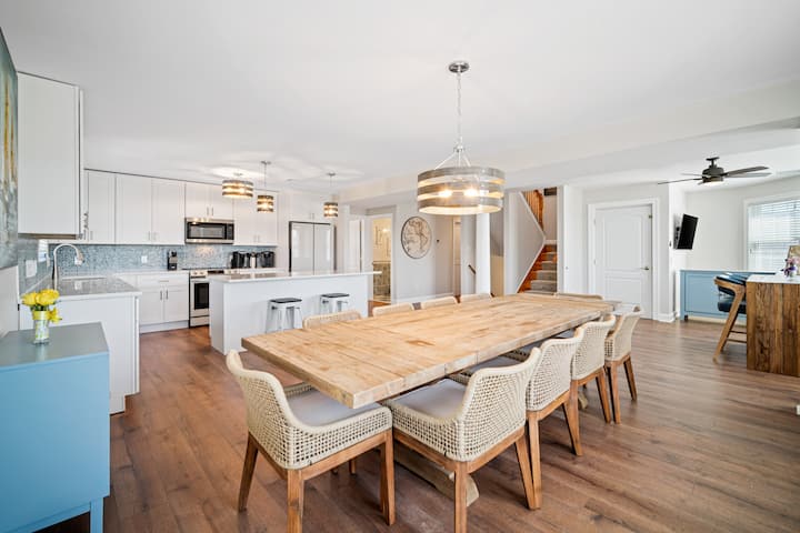 El corazón del alojamiento es una cocina de chef completamente nueva con capacidad para 18 huéspedes, equipada con electrodomésticos Samsung y Bosch de primera calidad. Una amplia sala familiar ofrece lujosos asientos, un televisor inteligente de 75 pulgadas y juegos y juguetes cuidadosamente seleccionados. Un elegante tocador está convenientemente ubicado fuera de la sala de estar principal.