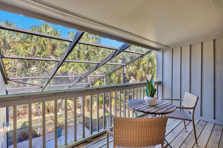 The condo is arranged for relaxed, everyday comfort, with an open living area that includes seating for unwinding, air conditioning and heating for year-round comfort, and Wi-Fi with a dedicated workspace when you need to stay connected. A TV provides simple entertainment, and soft daylight filters into the room throughout the day. The screened porch extends this space outdoors, offering a sheltered spot to enjoy the marsh view and the quiet surroundings.