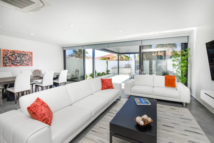 La luz natural inunda este moderno alojamiento vacacional en Aruba, destacando los elegantes pisos de baldosas, los muebles contemporáneos y la decoración elegante. El primer piso de concepto abierto cuenta con una cocina totalmente equipada y un acogedor comedor, perfecto para las comidas después de un día de aventuras en la playa.