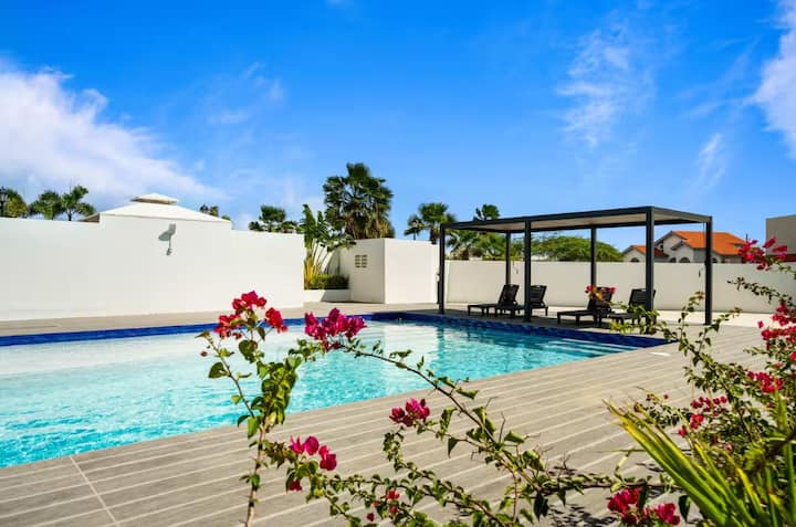 La piscina del condominio es un área común compartida por los huéspedes de todas las unidades. Se proporcionan reposeras para que te relajes y disfrutes del sol de Aruba.