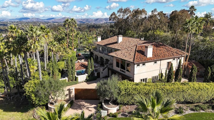 Ubicado a 10 minutos de la playa en el hermoso Rancho Santa Fe, nuestro lujoso refugio tiene todo lo que podrías pedir, incluyendo una piscina privada, jacuzzi, sala de cine, cancha de tenis/pickleball/baloncesto, bodega, 2 gimnasios y una sauna relajante perfecta para familias y grupos grandes. Disfruta de una cocina totalmente equipada, amplios dormitorios con baño privado, pickleball, noches de cine en familia y vistas impresionantes.