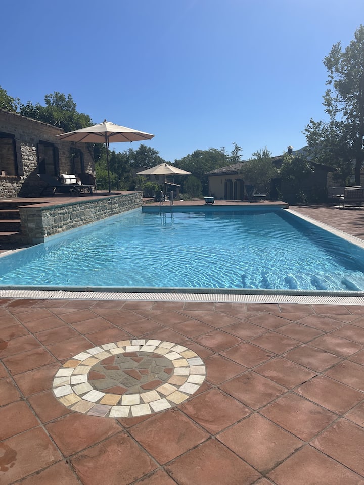 Portolo di Sapigno es una casa de campo aislada situada entre las colinas del Montefeltro. La propiedad cuenta con 3 dormitorios en la casa principal, una piscina privada y una cabaña separada con cocina, dormitorio doble y ducha. Ubicada a solo 35 km de Rímini y la Riviera Adriática, y cerca de las encantadoras ciudades de Sant'Agata Feltria, San Leo y Pennabilli, la casa está rodeada de jardines maduros y senderos panorámicos. Los niños deben estar bajo supervisión en todo momento en los terrenos.