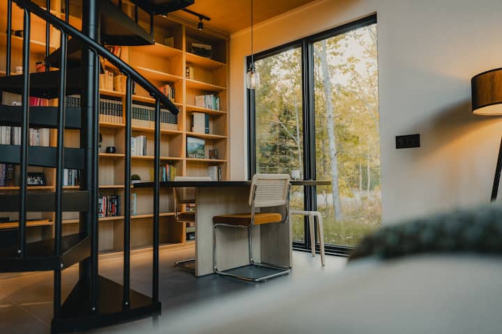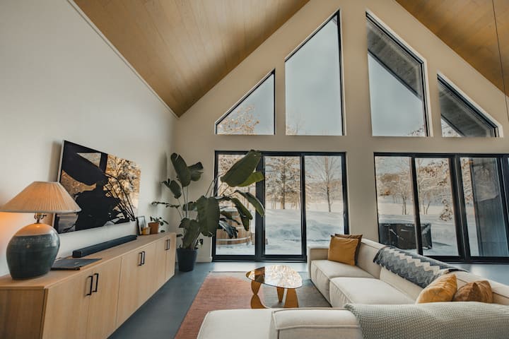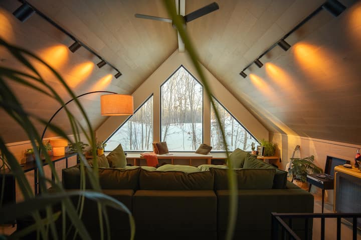 Durante el día, el sofá de la chimenea es el lugar más acogedor para acurrucarse con un buen libro, estirarse con una taza de café, jugar juegos o pasar el tiempo mirando el bosque a través de las ventanas del piso al techo. Por la noche, se convierte en una gran zona de descanso tamaño king donde puedes acomodarte y ver películas proyectadas en la pared.