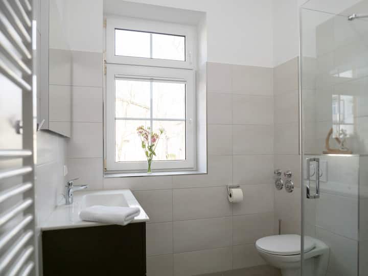 Das moderne Badezimmer mit Fenster verfügt über eine Dusche, ein WC, ein Waschbecken mit Unterschrank sowie einem Handtuchheizkörper.
