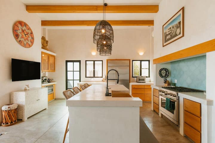 Relájate en la piscina privada, sumérgete en el jacuzzi con una brisa marina y pasa tus noches reunido alrededor de la fogata bajo cielos estrellados. Con múltiples áreas de estar al aire libre, un salón cubierto de palapa y un diseño interior y exterior, este alojamiento está hecho para las vacaciones.