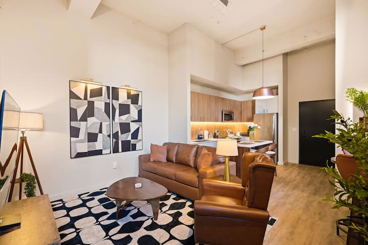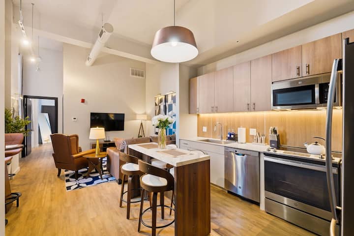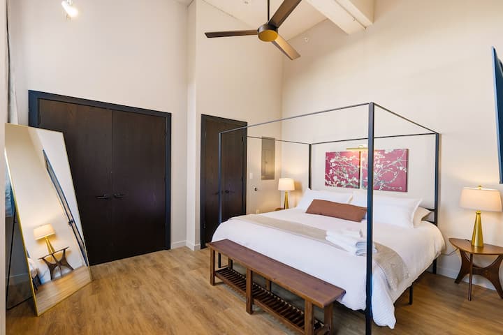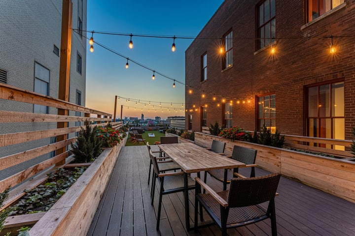 El Echelon es un magnífico loft de 1 dormitorio/1 baño, diseñado con buen gusto, con techos de 12 pies + ventanas de marco de acero de 7 pies y una cocina totalmente equipada. Comienza tu estadía con un café con leche recién hecho y algo del minimercado de abajo. Pasa la tarde descansando al sol junto a la piscina o desafía a tus amigos en la terraza de juegos de la azotea. Prepara algunos perritos calientes al atardecer y toma un corto viaje en Uber al estadio para un juego de los Cards, o mejora con filetes en Carmine's y un espectáculo en el famoso Fox Theatre