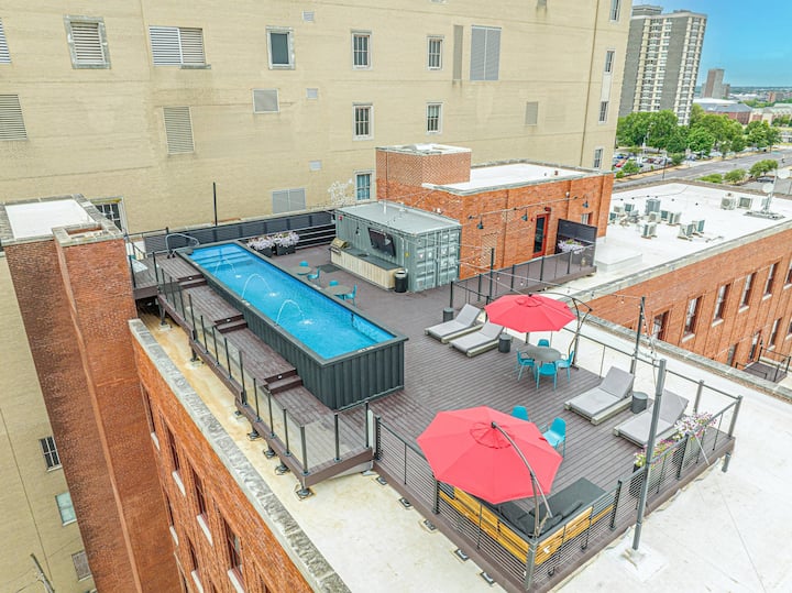 ● Piscina en la azotea: una piscina ecléctica en la azotea hecha a mano a partir de un contenedor de envío con asientos de salón, perfecta para las tardes soleadas y relajantes después de un día fuera (abierto desde el Día de los Caídos hasta el Día del Trabajo)