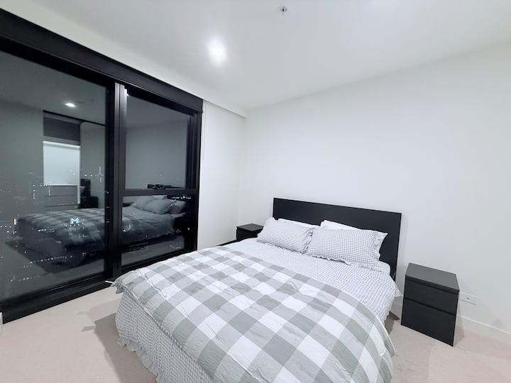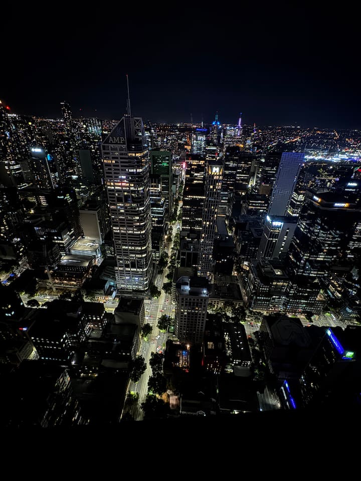 Este elegante apartamento ofrece impresionantes vistas a la ciudad y a la noche, interiores elegantes y una cómoda cama tamaño queen, perfecta para parejas, viajeros solitarios y huéspedes de negocios que buscan comodidad en el corazón de Melbourne.