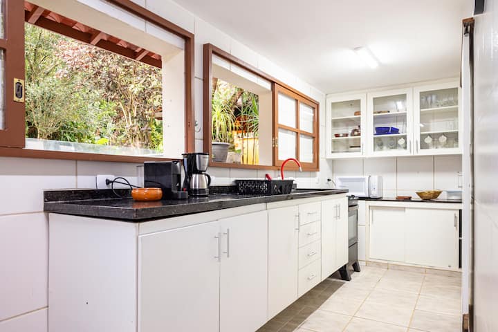 Las casas blancas y amarillas se alquilan juntas, por lo que el área total es exclusiva para el grupo de 10 personas con toda la privacidad y comodidad. Casa Branca tiene dos suites con aire acondicionado, siendo una suite con TV por cable, una caja fuerte y un escritorio. La planta baja tiene otra suite con aire acondicionado, inodoro y sala de estar con TV por cable. La cocina se encuentra cerca del área de la barbacoa/horno de leña y la piscina, además de que la casa tiene una señal WiFi.