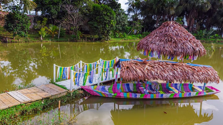 Habitacion en bungalow entre arboles frente a lago