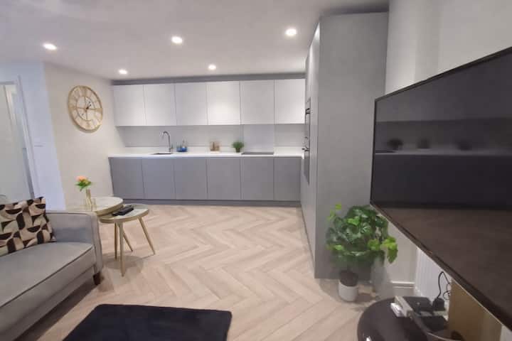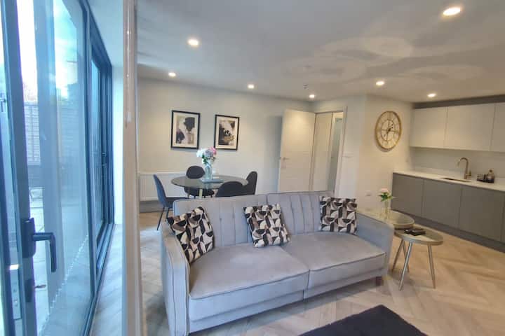 Un espacio amplio y acogedor con una cocina moderna y elegante, una mesa de comedor para hasta seis personas y un cómodo salón, perfecto para relajarse después de un día en Londres o para disfrutar de estadías más largas.