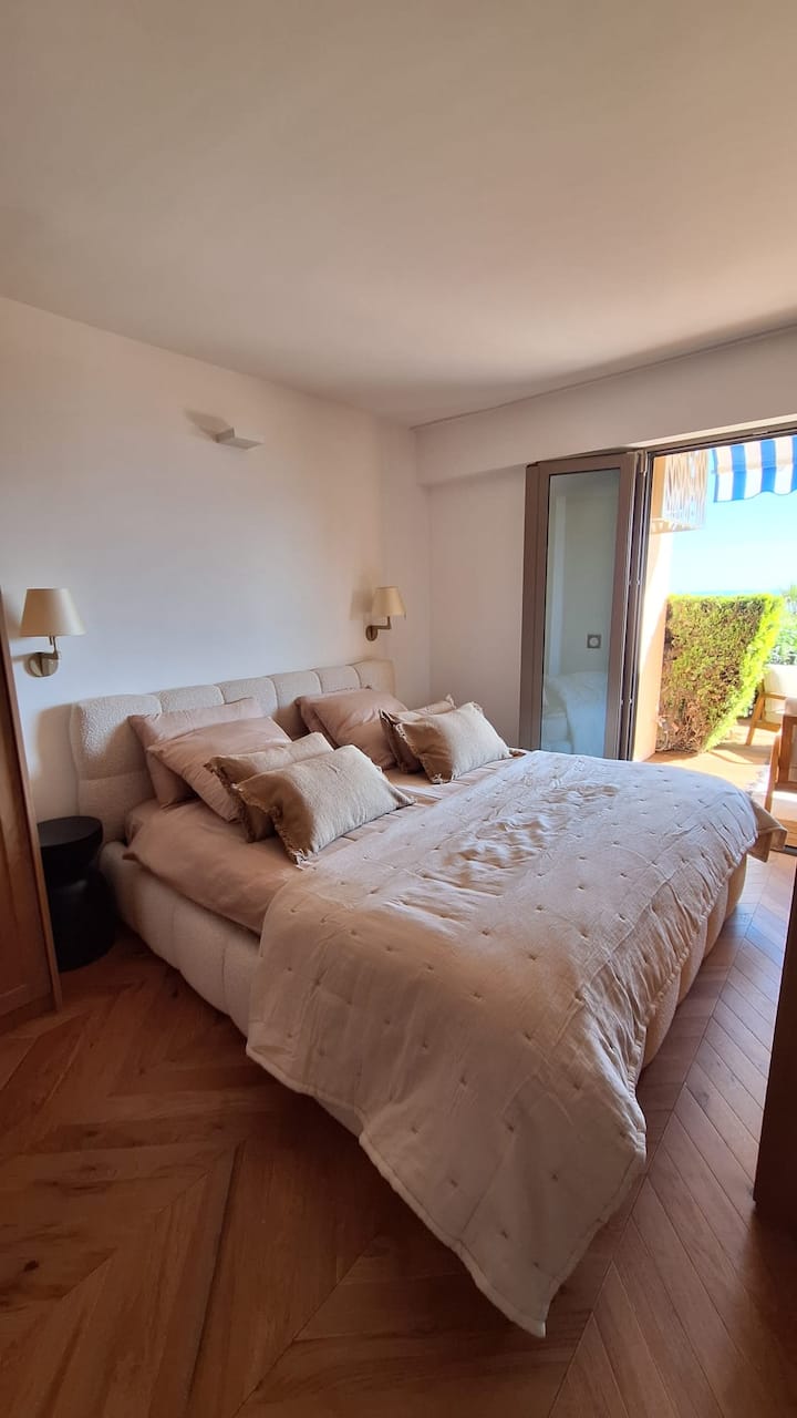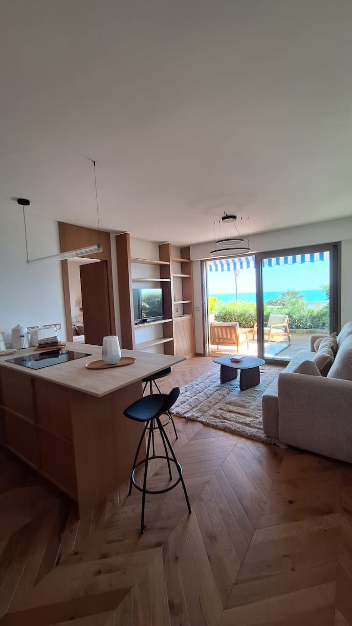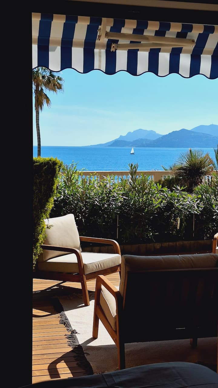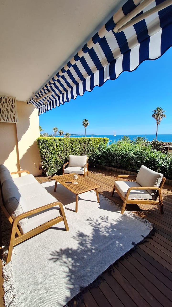 Una vida costera elegante con impresionantes vistas panorámicas al mar Mediterráneo y a las islas de Lérins, una terraza luminosa, acabados de alta gama y total tranquilidad junto al mar.