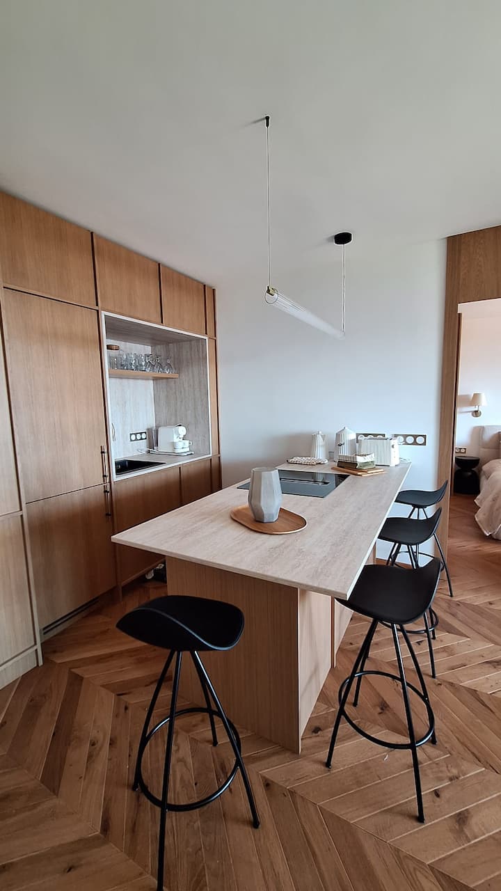 - Superficie: 45 m² - Terraza: 31 m² con vistas panorámicas al mar y mobiliario de exterior - Salón: sofá cama (140 x 200) y televisor grande - Cocina americana: frigorífico, hervidor de agua, tostadora, cafetera, horno, lavavajillas y zona de comedor para 4 personas - Dormitorio: cama king size (180 x 200) y 2 armarios - Baño: ducha y WC - Servicios: wifi de alta velocidad gratuito, lavadora, secadora, plancha y tabla de planchar, secador de pelo y caja fuerte - Otros: ropa de cama y toallas incluidas, artículos de aseo y productos básicos de limpieza