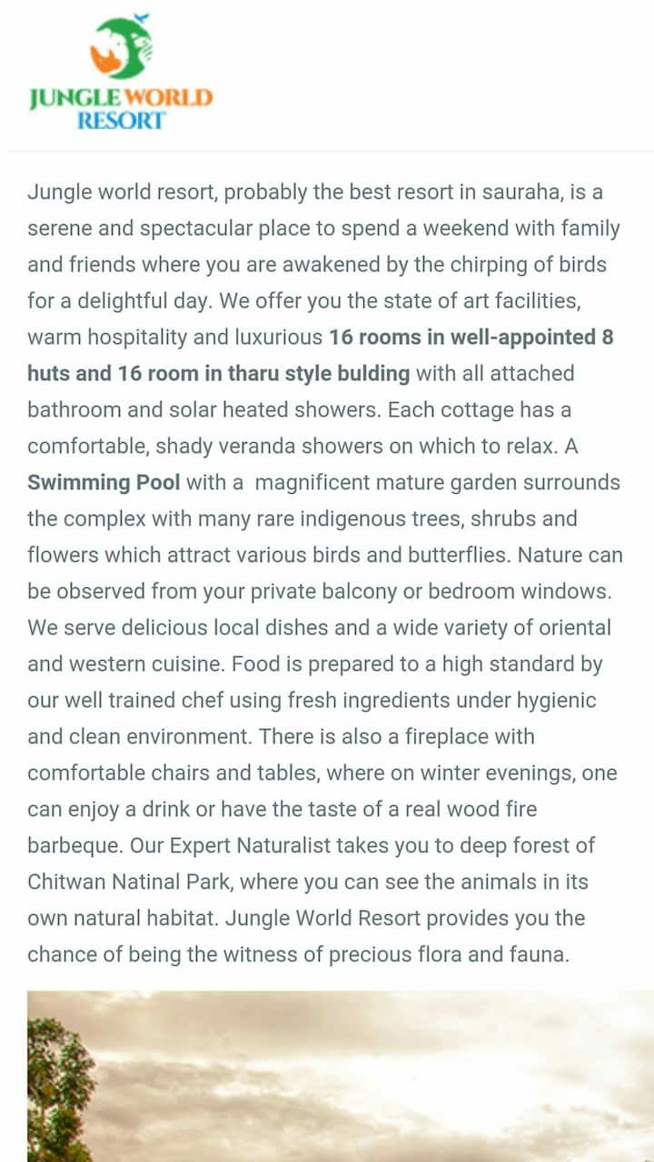 El mundo de la selva, probablemente el mejor resort, es un lugar sereno y espectacular para pasar un fin de semana/vacaciones con familiares y amigos donde te despierta la belleza de la naturaleza para un día encantador. Le ofrecemos las instalaciones de última generación que desea.
