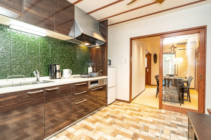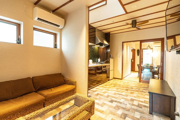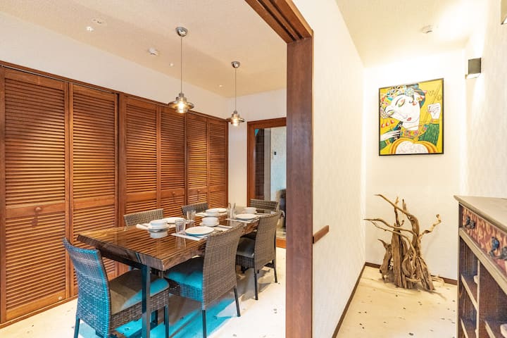 Con 4 dormitorios en total, dos baños, una sala de estar y un comedor, KYOBU-Higashiyama utiliza conceptos modernos para ofrecer una estancia cómoda para parejas, familias y grupos de hasta 10 personas. La casa tiene un distintivo ambiente asiático del este con muebles importados directamente de Bali, pero pronto notas su arquitectura japonesa junto a la escalera de madera y un hermoso jardín con un pino centenario.