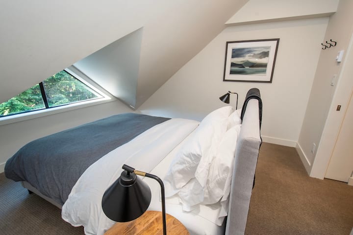 El nivel del loft de 500 pies cuadrados se compone de un dormitorio de 12' por 12' con techos inclinados y una ventana de buhardilla que contiene una cama tamaño queen, otra espaciosa área para dormir en el área abierta del loft con una cama tamaño queen que tiene privacidad visual desde el otro dormitorio del loft, un armario grande, un tocador grande, otro armario que contiene la lavadora y secadora, un área abierta y, finalmente, un baño completo con una increíble ducha de vapor de dos bancos que tiene capacidad para cuatro personas. El loft ha sido diseñado para que haya privacidad visual para la cama en el loft abierto (al salir del dormitorio del loft para ir al baño o bajar las escaleras, las paredes del baño y del armario bloquean la vista de la gran mayoría de la cama del loft abierto). El baño del loft tiene puertas de bolsillo de núcleo sólido en dos lados para que los huéspedes del dormitorio loft puedan acceder al baño sin molestar a los huéspedes del loft abierto, y cuenta con suelos radiantes y azulejos de gran formato.