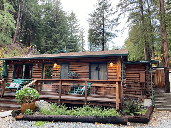Esta casa de estilo cabaña de troncos de la década de 1950 se encuentra entre secuoyas en ocho acres que llamamos Ryder Rancheria.