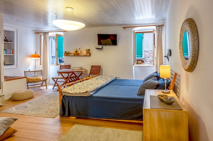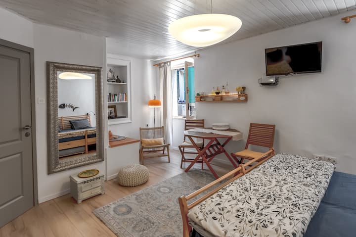 Nuestro acogedor estudio con cama doble grande y cómoda está en el corazón del casco antiguo de Rovinj, a solo 50 metros del mar, a 150 metros de la plaza principal con muchas cafeterías y restaurantes encantadores en el barrio.