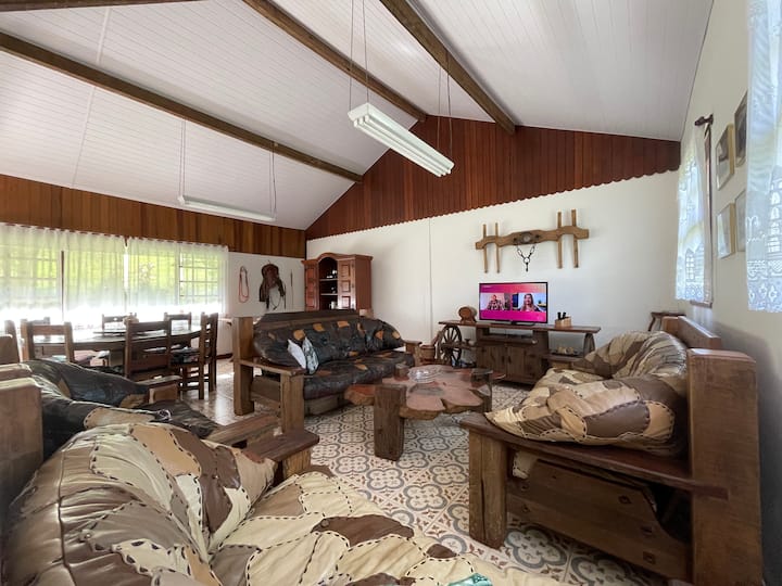 167.000 m² de espacio de ocio - Capacidad para 17 personas en camas. Propiedad muy verde, extremadamente acogedora, alojamiento cómodo. Lagos y piscina, suministrados con agua cristalina directamente de la mina de agua, casa del árbol (decorativa), hermoso césped, columpios, barbacoas, horno caipira, barco para un paseo por el lago, peces, campo, etc. No es un condominio, es un espacio 100 % privado, exclusivo para ti, tu familia y tu grupo. Casa totalmente amueblada y equipada que ofrece a los huéspedes una mayor comodidad.