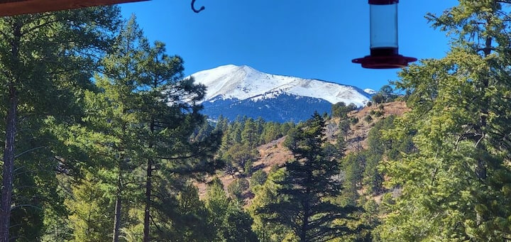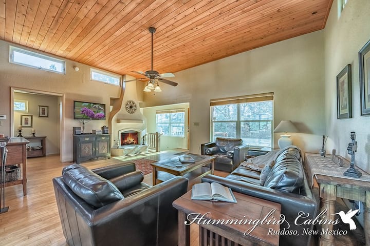 "Soar Above It All" en Eagles Rest! Este refugio de estilo español en la cima de una montaña ofrece vistas inigualables de Sierra Blanca. Disfruta de techos altos y grandes ventanales que aportan luz natural. La planta principal incluye una acogedora sala de estar con chimenea de gas, comedor, cocina y lavandería. Abajo, encuentra 2 dormitorios y 2 baños. Relájate en las terrazas y relájate en el aire fresco de la montaña. Se admiten perros. NOTA: el aire acondicionado central está SOLO en el área de estar principal; la planta baja se mantiene fresca con ventiladores de techo.