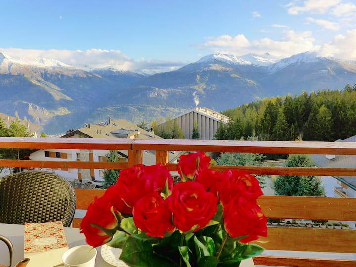 Apartamento "Grand Large A/B". En el centro vacacional a 200 m del centro de Montana, en un lugar soleado, a 1,1 km del lago, orientado al sur. En la casa: ascensor, espacio de almacenamiento para esquís, sistema de calefacción central, lavadora, secadora (para uso compartido, adicional), sala de secado. Estacionamiento (número limitado de plazas). Tienda 200 m, supermercado 240 m, restaurante, panadería 300 m, 2 minutos a pie del centro, parada de autobús "Montana Poste" 100 m, estación de tren "Funiculaire Montana Gare" 210 m, lago de baño "Moubra" 1,7 km, lago Grenon 1,1 km. Campo de golf (18 hoyos) a 2,2 km, instalaciones de esquí a 1 km. Se puede llegar fácilmente a los lagos conocidos: Lac de la Moubra 1,7 km, Etang Long a 2,2 km. Por favor, ten en cuenta: autobús de esquí (gratuito). Los pisos se cuentan como niveles (calculados desde la parte inferior del edificio).