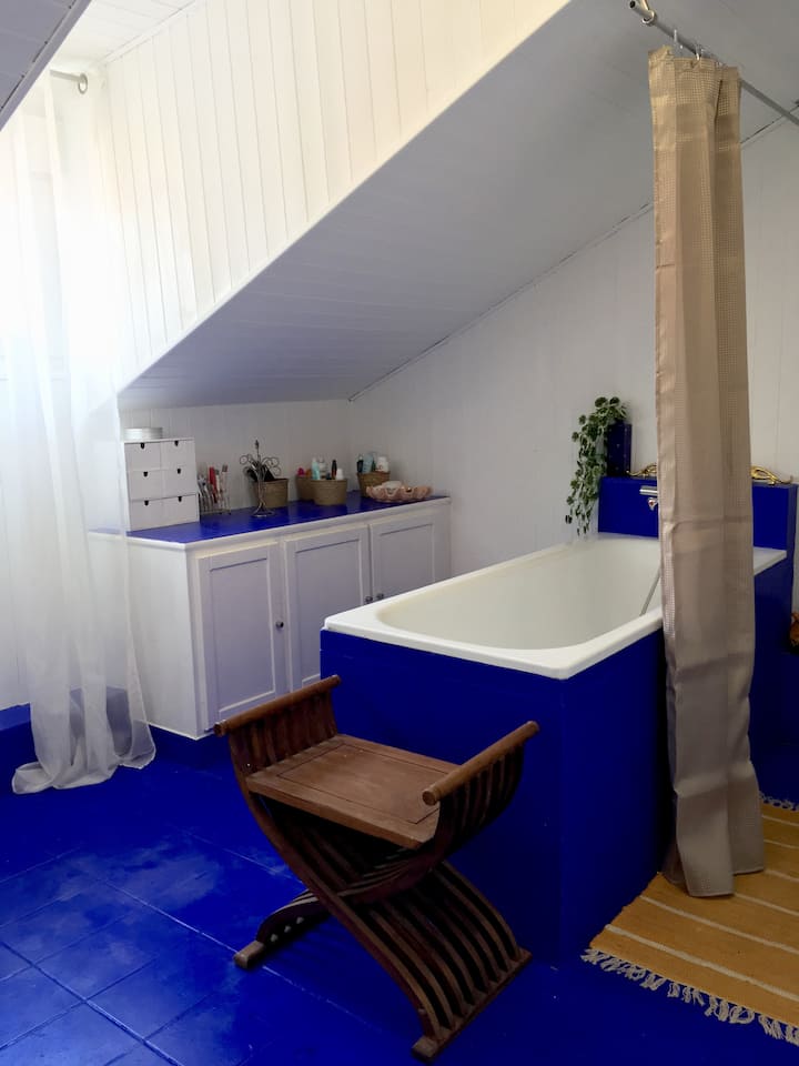 En el tercer y último piso, con un dormitorio, una gran sala de estar abierta a la cocina, comedor y un gran baño de color azul Majorelle.