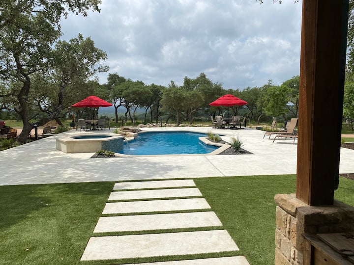 ** Privado: 6 patios, piscina, spa, campo de juegos, fogatas, jardín para recoger y comer, senderos