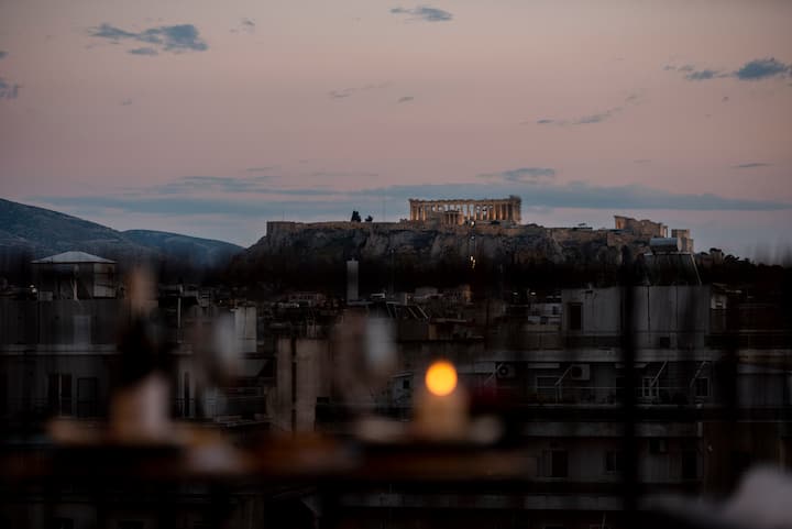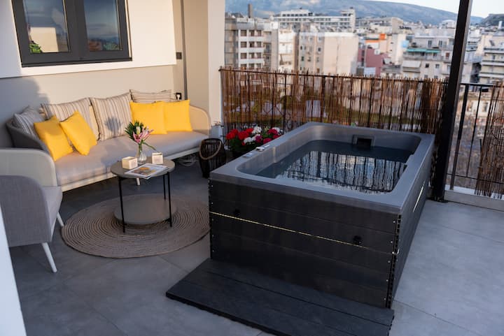 Jacuzzi de 180° con vistas a la Acrópolis al atardecer
