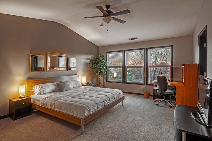 Con 4 dormitorios y 2,5 baños, la casa tiene mucho espacio para dispersarse. Tres dormitorios cuentan con cómodos colchones tamaño queen, mientras que el dormitorio principal cuenta con un nuevo colchón tamaño king, todo equipado con sábanas suaves y almohadas suaves. Varios dormitorios ofrecen su propio televisor inteligente, listo para transmitir tus programas favoritos desde tu cómoda cama. En el baño principal, disfruta de una bañera profunda de gran tamaño y una ducha independiente, con todos los elementos básicos del baño, como toallas de baño grandes, toallas de mano y más.