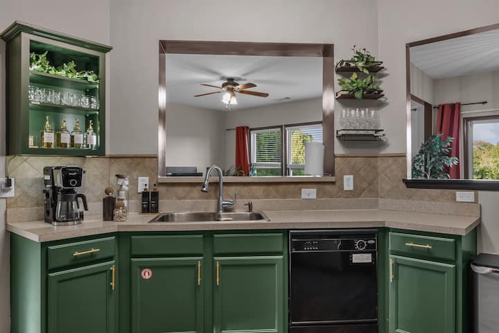 La cocina está bien equipada con ollas, sartenes y utensilios de cocina nuevos. Encuentra todo lo que necesitas para cocinar una comida deliciosa y aprovecha los pequeños electrodomésticos como una cafetera Keurig, cápsulas de café, tostadora, licuadora y más.