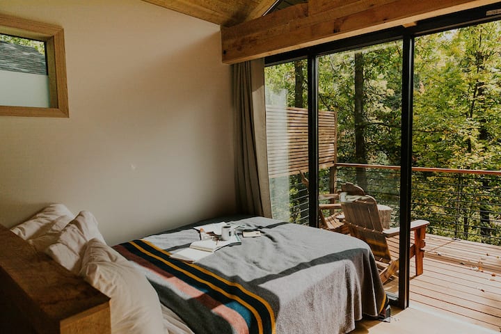La cabaña estará totalmente equipada con todo lo que necesitas y más para una increíble aventura en el polvo rojo. La cómoda cama tamaño queen (consigue el mejor descanso nocturno en nuestro colchón de lujo Tuft & Needle), tiene vistas al bosque a través del vidrio del suelo al techo y tiene capacidad para 2 adultos.