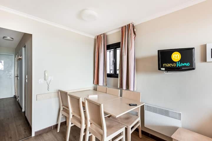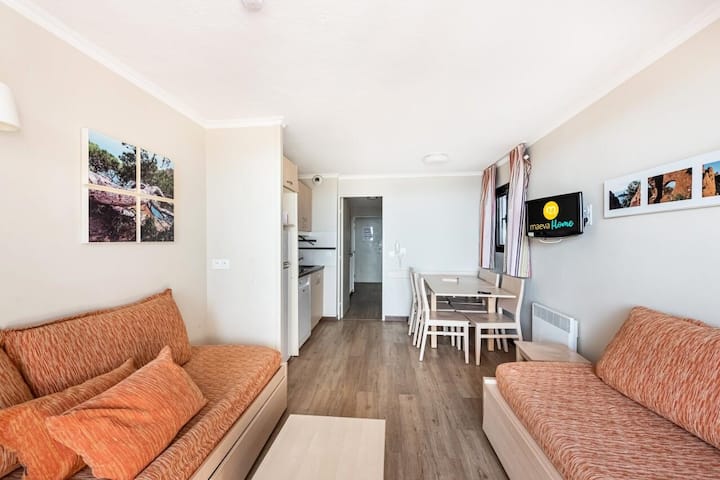 Autres caractéristiques : Bouilloire, Cafetière, Cuisine, Detecteur fumée, Four micro-ondes, Grille-pain, Lave-vaisselle, Nombre de chambres : 2, Nombre de pièces : 3, Parking, Piscine commune, Plaque de cuisson, Réfrigérateur, Télévision, Vaisselle et couverts