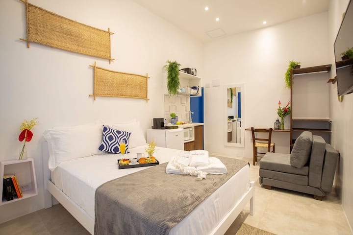 El encantador estudio, con arquitectura griega, está estratégicamente ubicado en Higienópolis, un barrio exclusivo de São Paulo, cerca de la estación de metro de Higienópolis (Línea 4 - Amarilla) y cerca de excelentes bares y restaurantes locales. El edificio cuenta con un hermoso jardín y un agradable solárium, que ofrece una experiencia única durante tu estadía. La propiedad está equipada con TV inteligente, cocina bien equipada, espacio de trabajo, internet ultrarrápido, cama doble y aire acondicionado.