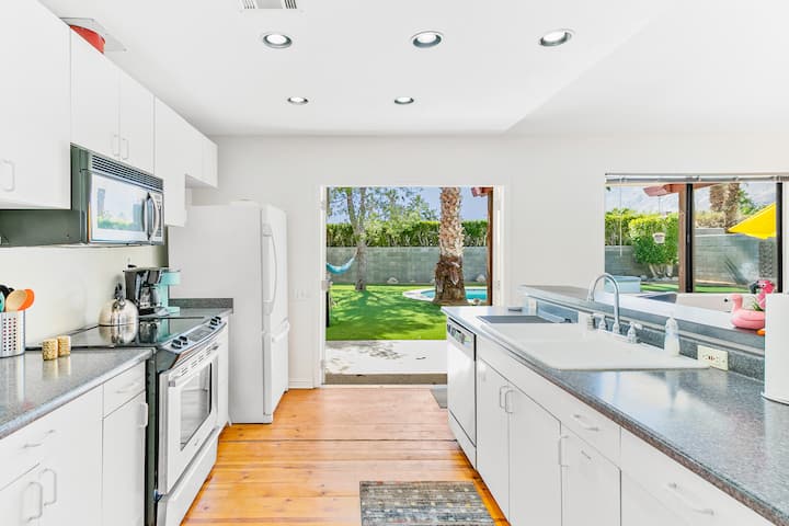 Al entrar en el alojamiento, sentirás al instante el ambiente de Palm Springs. Los colores vibrantes de la decoración, además de los detalles de la palma, proporcionarán el escenario perfecto para la relajación. Una cocina totalmente equipada con una estufa de gas ofrece una gran experiencia culinaria para el chef de tu grupo. Con cómodos asientos en la sala de estar, reúnete alrededor de la chimenea y ve una película, lee un libro o juega.