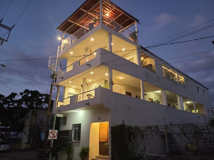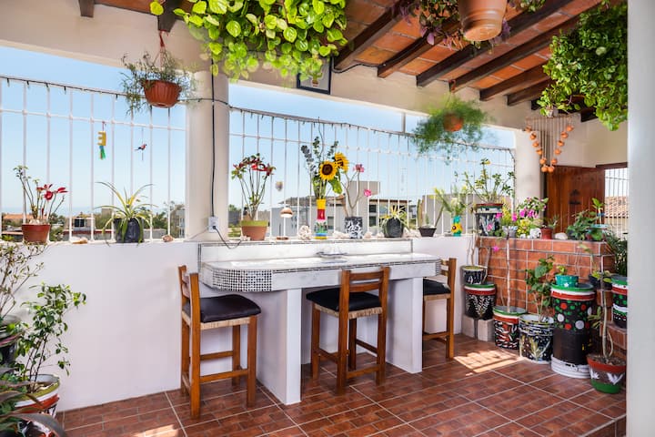 Hay una zona de comedor con barbacoa compartida en nuestra terraza abierta de la tercera planta, donde puedes disfrutar de la brisa marina, admirar las vistas o simplemente relajarte y conocer a nuestros otros huéspedes. Una escalera de caracol a la palapa del techo da una gran vista de los gloriosos amaneceres y puestas de sol