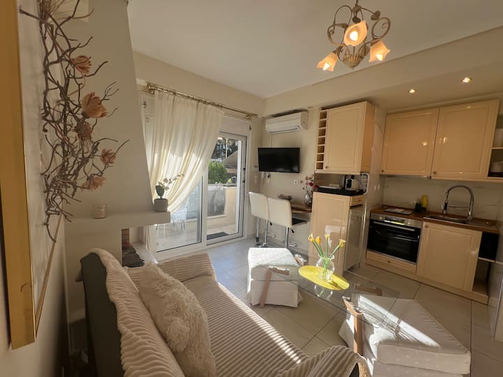 5,0 ★ El espacio (estudio) tiene una entrada independiente. Diseñado con muebles modernos, cocina equipada, luminoso, en un barrio tranquilo y seguro de Maroussi. El apartamento es de 30 m², con un completo equipamiento de calidad, sus rincones cuidadosamente decorados y la iluminación visible u oculta estudiada (con leds) que enfatizan los detalles elegantes, se sentirá como en casa. Los libros selectos de la biblioteca le ayudarán a disfrutar de su estancia en nuestro tranquilo y verde barrio. Sensación absoluta de calma y relajación en el balcón del apartamento o en la sala de estar leyendo o viendo la televisión. Disfrutarás de tus horas de sueño en la cama doble con el colchón seleccionado de calidad superior. En la sala de estar hay: un sofá semidoble que se convierte en una cama para alojar a un tercer (3er) huésped. Delante del sofá hay una mesa de madera con una superficie de cristal. Hay una mesa/escritorio de madera plegable adecuado para trabajar (con su ordenador portátil) y (2) dos taburetes de altura ajustable. En el gran armario biblioteca encontrará espacio de almacenamiento adicional incluso para largas estancias. Es posible utilizar la lavadora dentro del apartamento. La chimenea no se utiliza, es decorativa. Para la entrada independiente del apartamento, los huéspedes subirán (con barandilla de apoyo) seis (6) escalones. No es adecuado - no se recomienda para los huéspedes que utilicen silla de ruedas y para aquellos que tengan dificultades de movilidad.