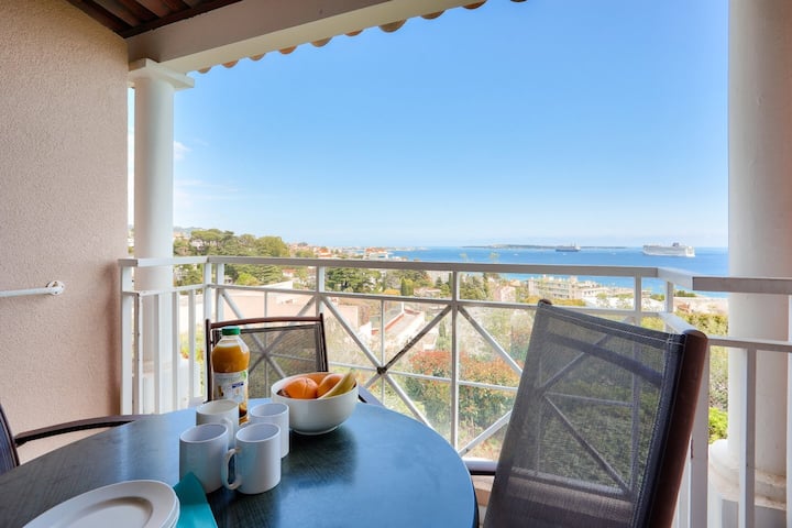 Las ventajas de tu alquiler: apartamento de 2 habitaciones para 4 personas con balcón que ofrece vistas al mar y se beneficia de una piscina en la residencia.