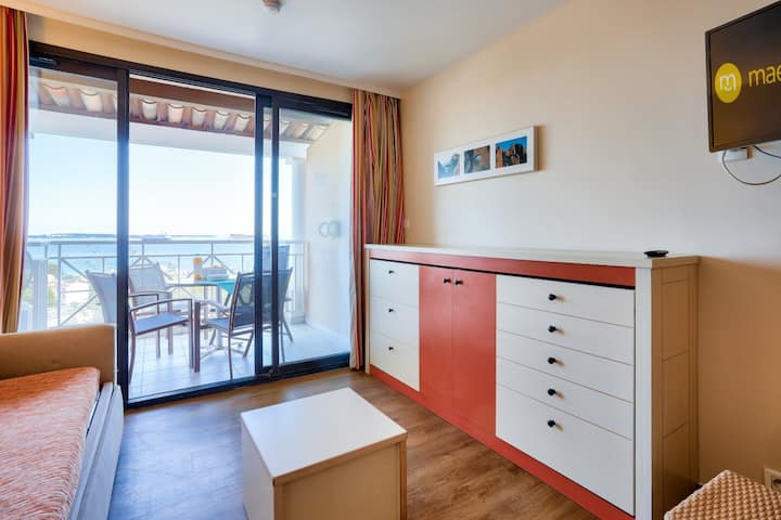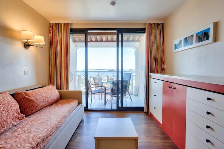 Las ventajas de tu alquiler: apartamento de 2 habitaciones para 4 personas con balcón con vistas al mar y piscina en la residencia.