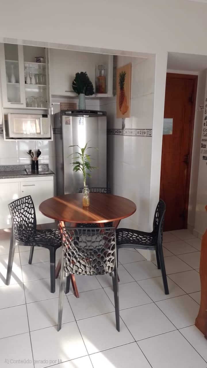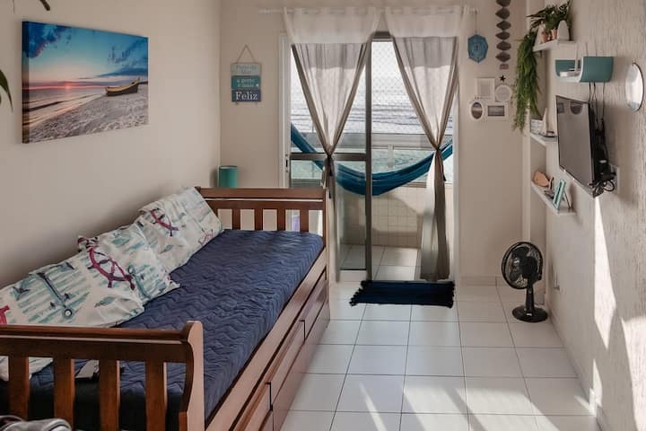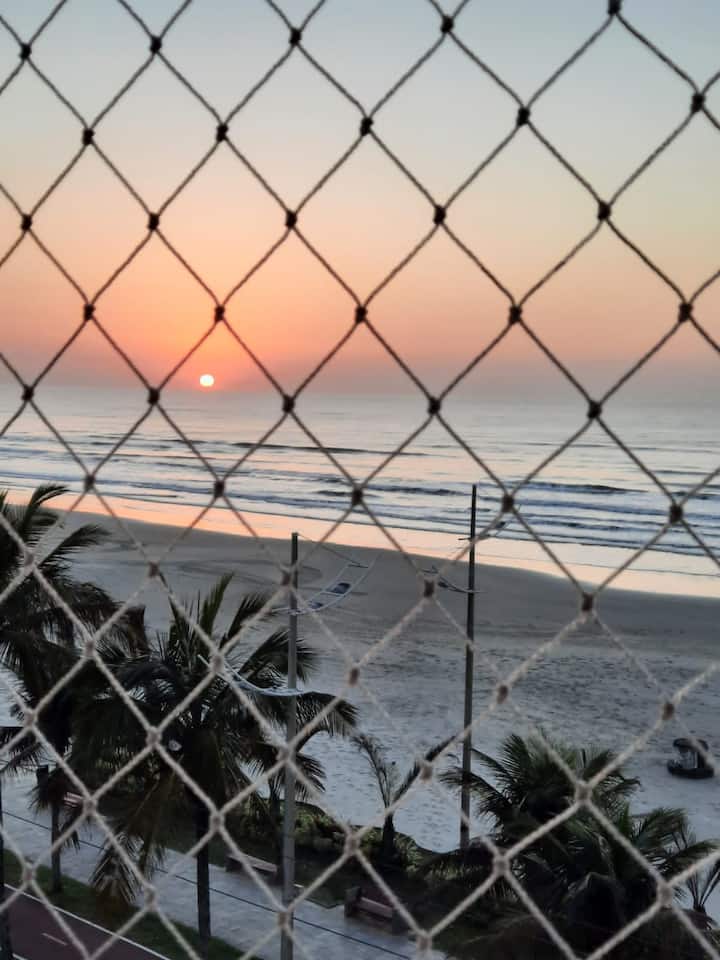 Apartamento frente al mar con vista al amanecer . Un espectáculo que la naturaleza te ofrece, vale la pena despertarse temprano para ver . " Situado en Praia y Bairro Jardim Real ", al final de Praia Grande , casi bordeado por Mongaguá . El mapa de (Oculto por Airbnb) no se actualiza. Esto lo está dando como Vila Tupi , ¡y no lo es! Capacidad para hasta 5 personas Si eres una pareja , diría que sería ideal para una hamaca con vistas y brisa del mar.