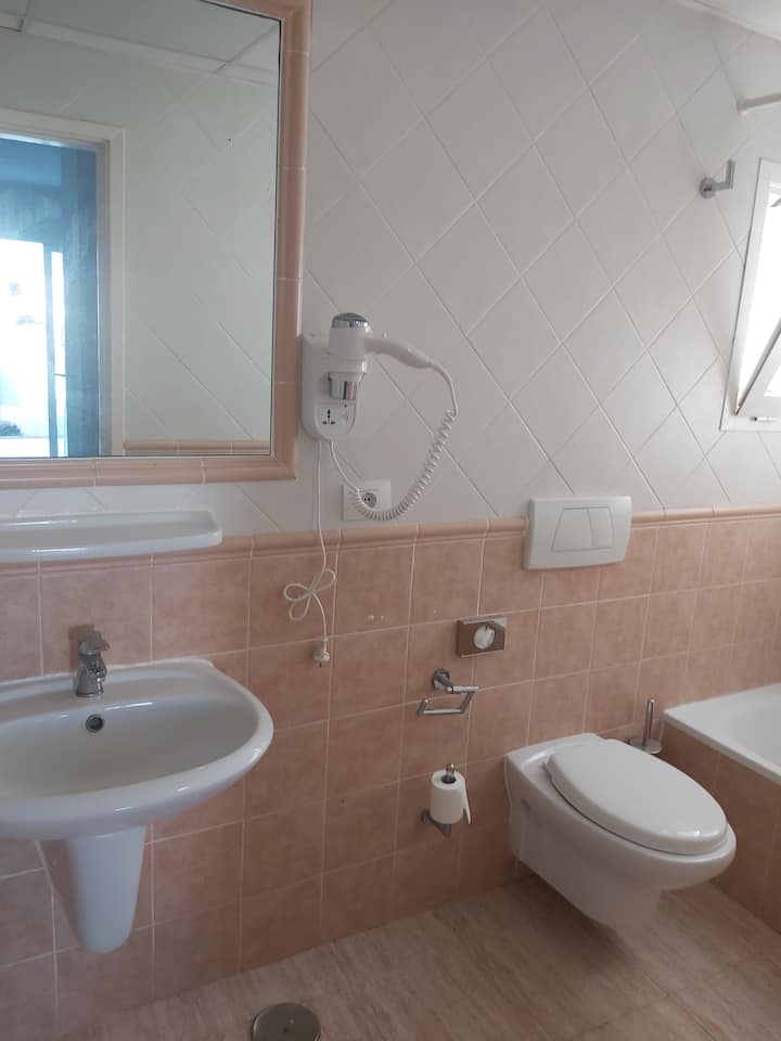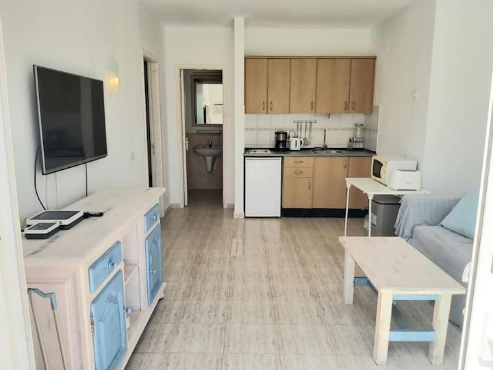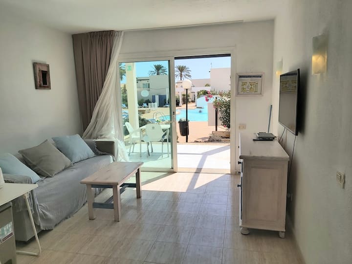 Playa a 300 m, piso espacioso frente a la piscina, wifi rápido