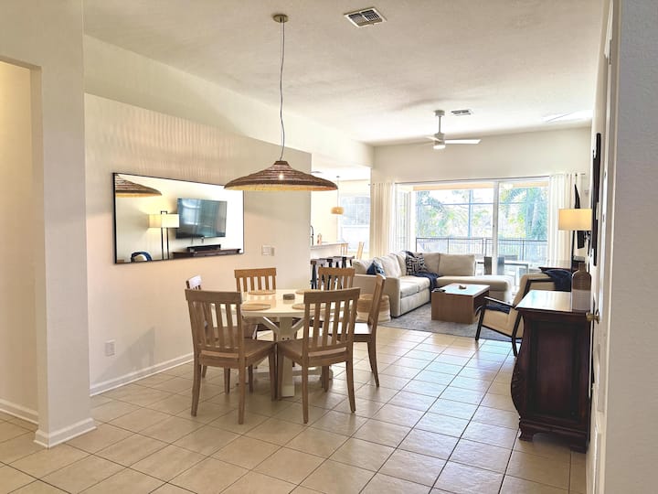 Más allá de la pared corrediza de vidrio en la gran sala, hay un lanai protegido con una gran piscina y spa orientada al SUR/WEST, completa con iluminación de cambio de color LED. También hay tumbonas en el patio para tomar el sol y un comedor para seis personas al aire libre, para que puedas disfrutar de una comida al aire libre cuando quieras. Este alojamiento también te ofrece mucha privacidad en un área de conservación sin VECINOS TRASEROS directamente detrás de ti. ¡Es como tener tu propio centro vacacional privado!