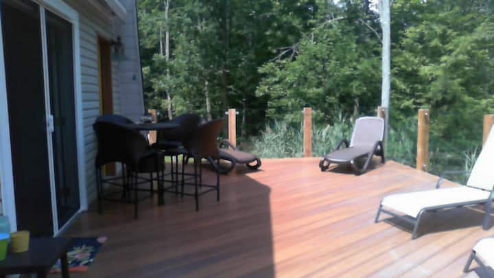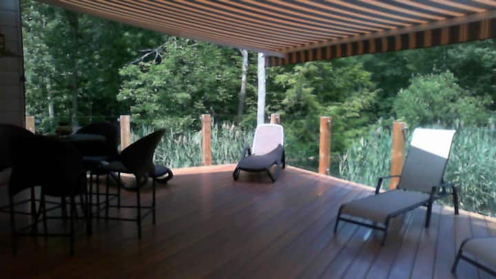 Encanto del patrimonio, nueva comodidad central para lo mejor de SW Ontario. Oasis soleado rodeado de bosque tranquilo en uno con la naturaleza por dentro o por fuera. Música para sus oídos de la naturaleza y/o altavoces controlados por separado en todo y fuera. 2 suites privadas 1 abajo, 1up con vista a los pájaros de la piscina, cubierta inferior, senderos forestales, característica de la cascada del estanque y arroyo a gran estanque/cañas. A 5 minutos de la pintoresca ciudad de Waterford y estanques/paseos en bote/pesca, sendero Trans Canada. 1/4-1 hr a las ciudades/playas/pesca frente al lago y Cataratas del Niágara