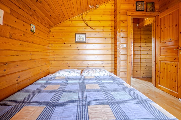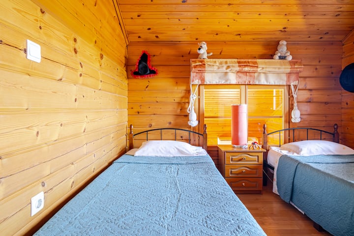 Agradable casa de madera con chimenea interior.