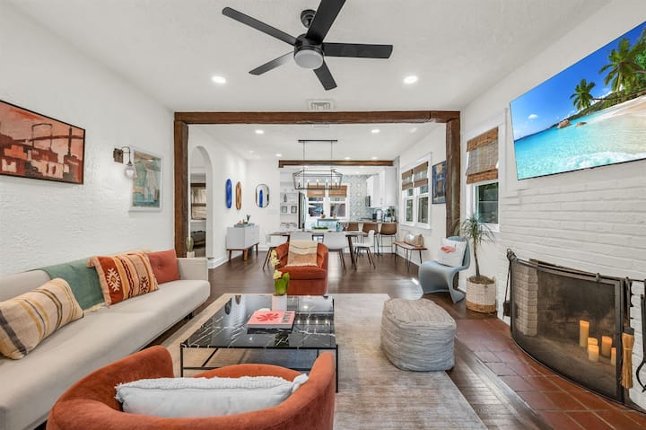 Bienvenido a tu santuario tropical en el corazón del histórico Flamingo Park, donde el estilo California Mission se encuentra con el encanto de Palm Beach. Cuando entras por la puerta principal, te recibe un acogedor espacio diseñado con elegancia boho-chic y comodidades modernas. Cada habitación en esta villa española bellamente remodelada cuenta una historia, mezclando un estilo vintage con un lujo actualizado. Perfectamente adecuado para familias, solicitantes de sol, amantes de las mascotas y cualquier persona que aprecie el buen diseño, esta casa ofrece el mejor refugio para la relajación y la aventura en West Palm Beach. ¡8 plazas cómodamente!