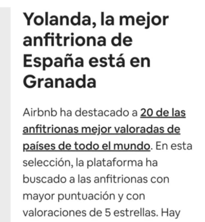 Me llamo Yolanda y estaré encanta de alojarte en cualquiera de mis apartamentos, puedes contactar fácilmente conmigo a través de la aplicación. Yo vivo al lado de mis apartamentos lo que me facilita mucho el poder estar muy pendiente para cualquier eventualidad. Puedes preguntarme cualquier duda que tengas e intentaré resolverla. Muchas gracias de antemano.